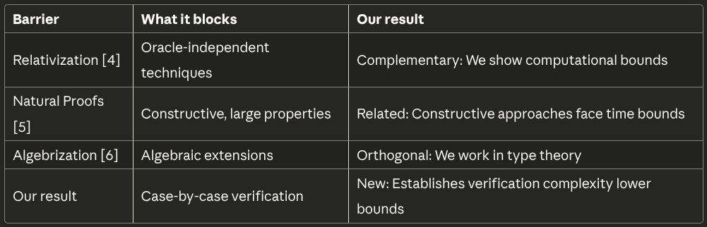 Natural proofs barriers [5]: Certain “natural” proof strategies are blocked by cryptographic assumptions